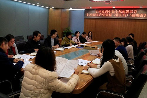 25号上午,工学院召开会议,学习《中共共产党章程(修正案)》的决议,全体党支部书记、教师党员代表参加会议。与会人员在党委书记于翠霞的带领下,深入学习了文件精神。