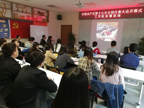 10月18日上午,工学院在学研c833和 c834两个会场组织党员和师生代表集中收看十九大开幕式及习总书记报告。学院党委委员、学校第十一次党员代表大会代表、教工、学生党支部书记以及师生党员代表共计60余名同志参加。