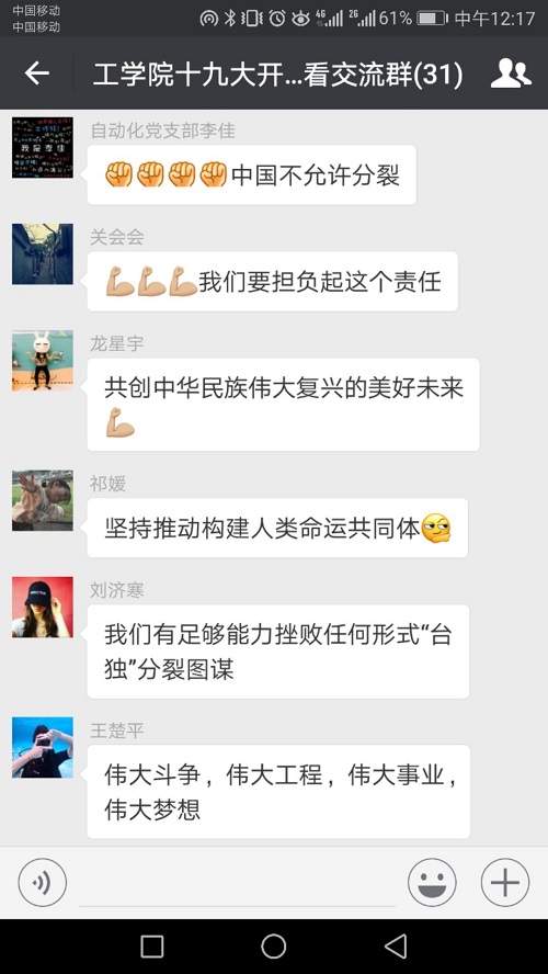 此外,不能到场的师生也积极通过电视、网站、两微一端等途径进行了收听、收看。学院还建立了十九大开幕式交流群,大家纷纷在群里分享交流收看开幕式的感想。